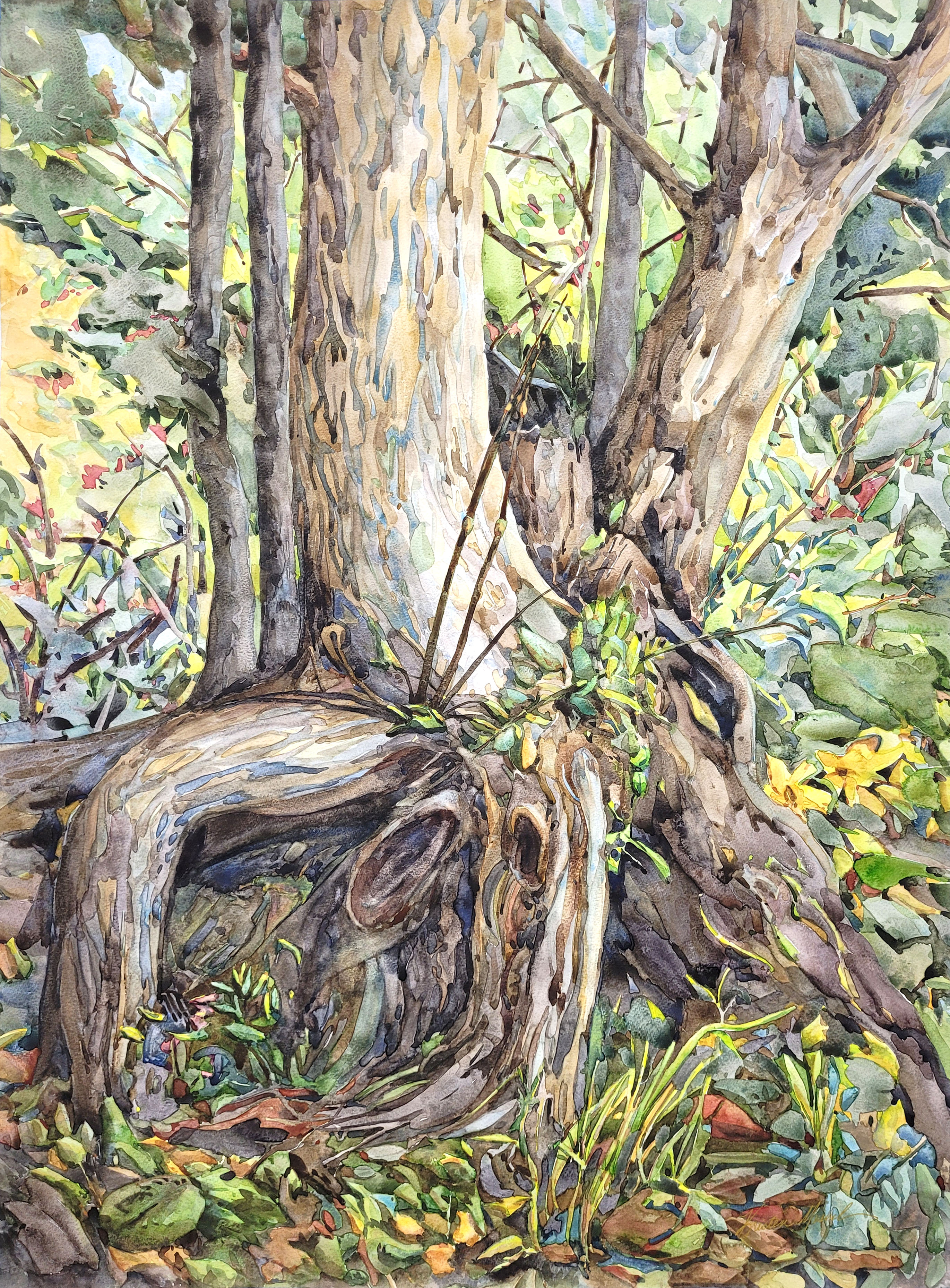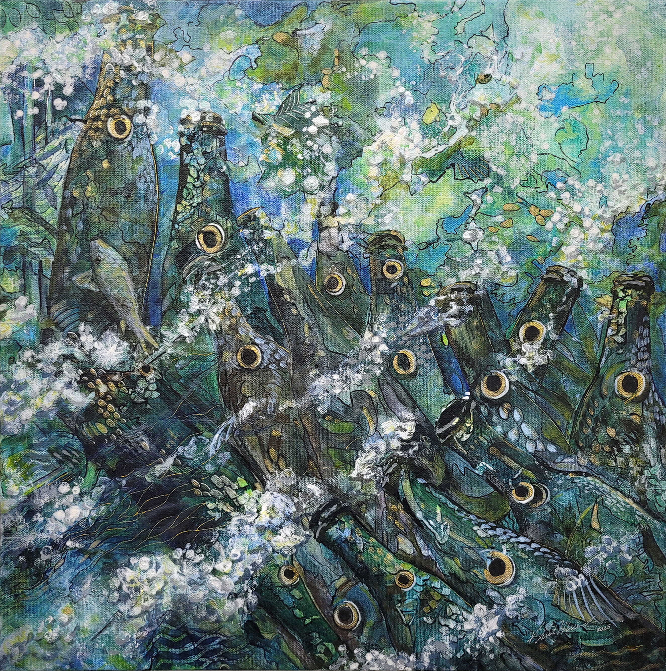 This most recent body of work connects the spontaneity of plein air watercolors to a deliberate expressionist construct that encourages viewing at both a comprehensive and intimate level; glimmering as the viewer shifts position. I use a language of mark-making and patterns to interpret the enigmas of our frenzied modern culture and our yearning for deep connection to our precious natural environment. It is the allure of nature’s beauty, intermingling with contemporary distracted life and the frolic of my mind, which guides my expressionism.